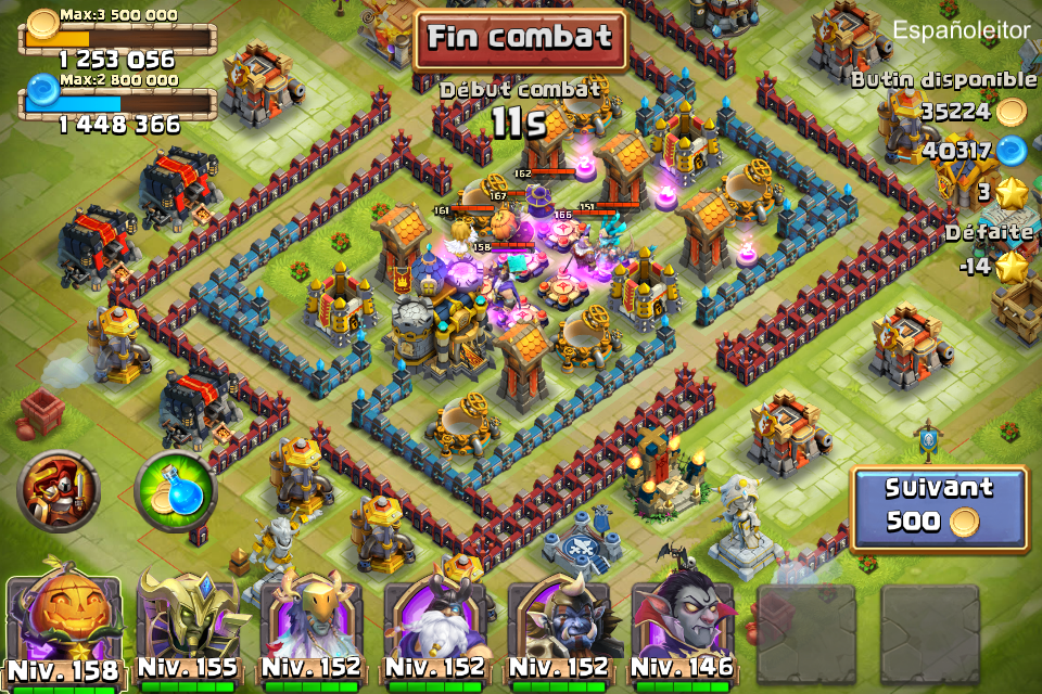 A la partie inférieure de l’écran, un bouton “Suivant”. Le but est de passer le Raid rencontré avant d’avoir attaqué pour en avoir un autre. Cela vous coûtera la même quantité d’or après avoir commencé la 1ère recherche. Ce bouton va disparaître lorsque vous déposez une unité/magie sur la base de l’attaquant, ou si les 30 secondes de délai d’attente sont écoulées.